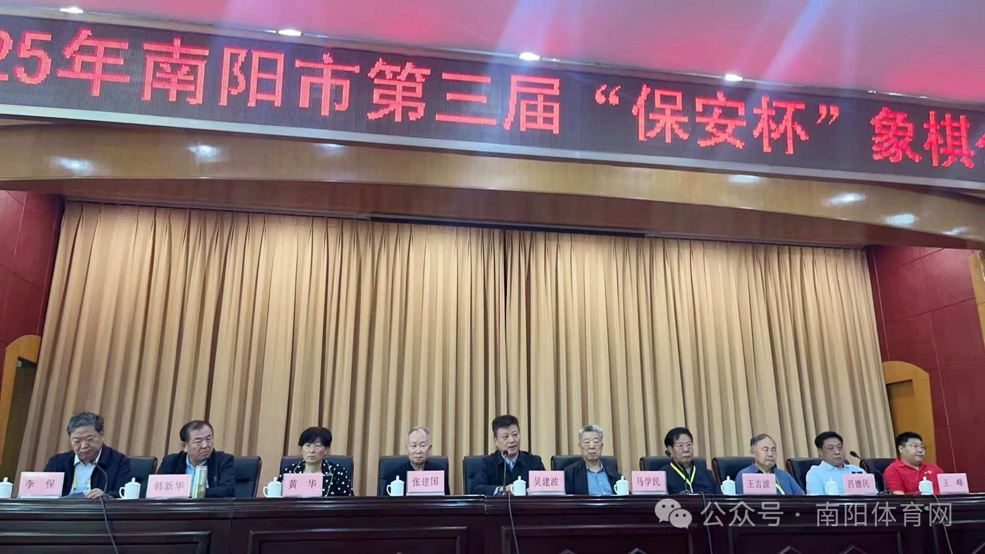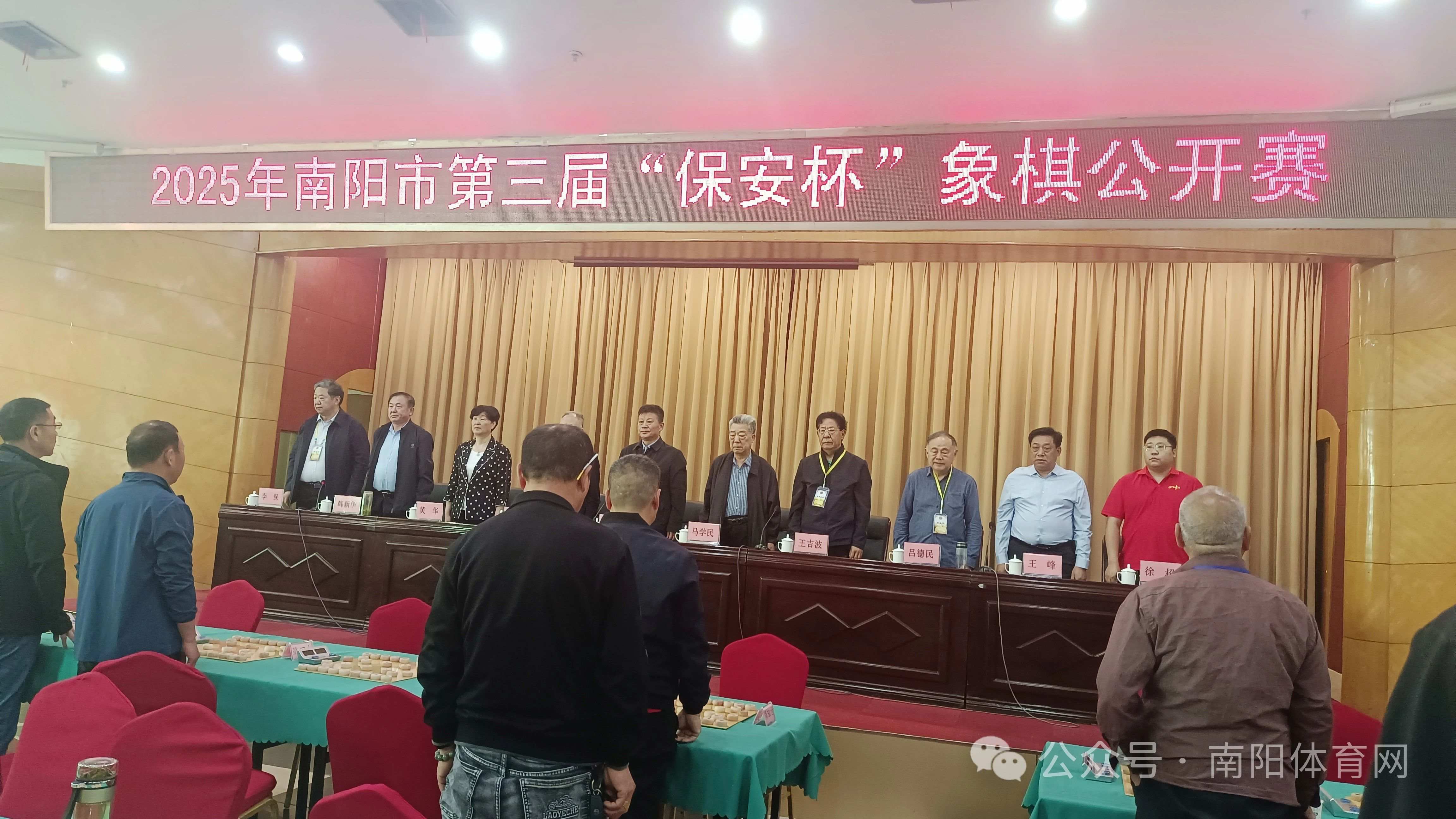 开赛仪式由市象棋协会副主席李保主持。河南省棋类协会副主席、南阳市象棋协会名誉主席马学民,市象棋协会名誉主席王吉波,市卫生健康体育委员会党组成员、副主任吴建波,市象棋协会常务副主席吕德民,市老年人体育协会副主席黄华,市保安公司党委书记、总经理张建国,市象棋协会副主席韩新华,市保安公司工会主席王峰,河南寿酒集团驻南阳区域总经理徐超出席开幕式。