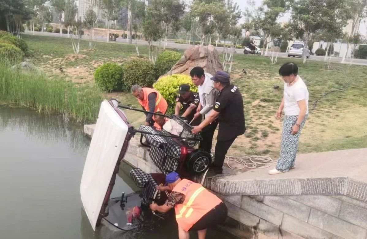 当时,这辆三轮代步车落水时,附近市民和游客的惊呼声引起了保安田水斌、杨顺功的注意,他们立即冲向事发地点,此时三轮代步车已大半没入水中。