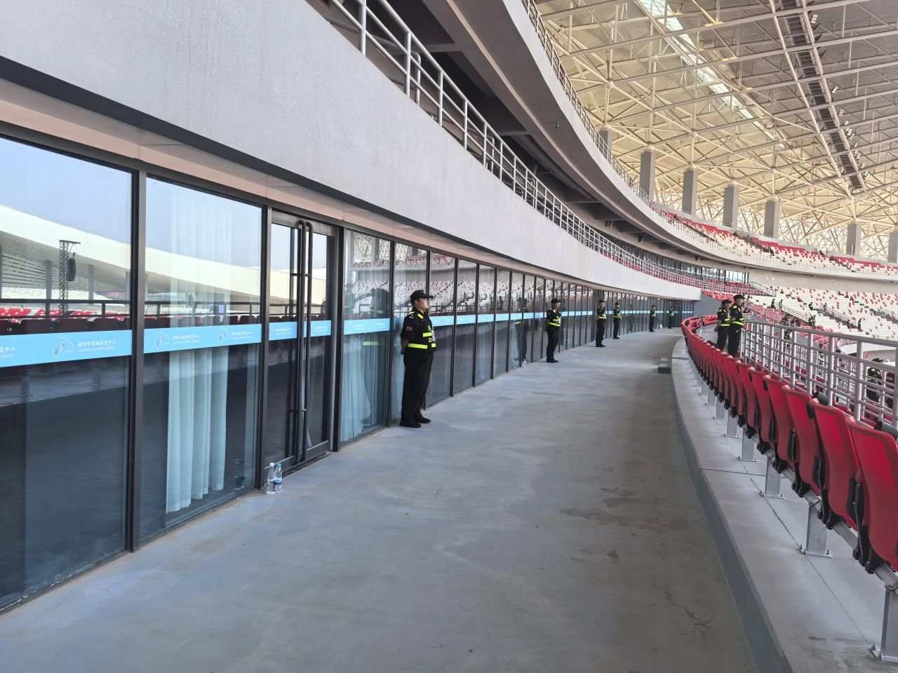 △龙跃十大队队员在看台环廊执勤时,帮助医护人员抬医疗器械
