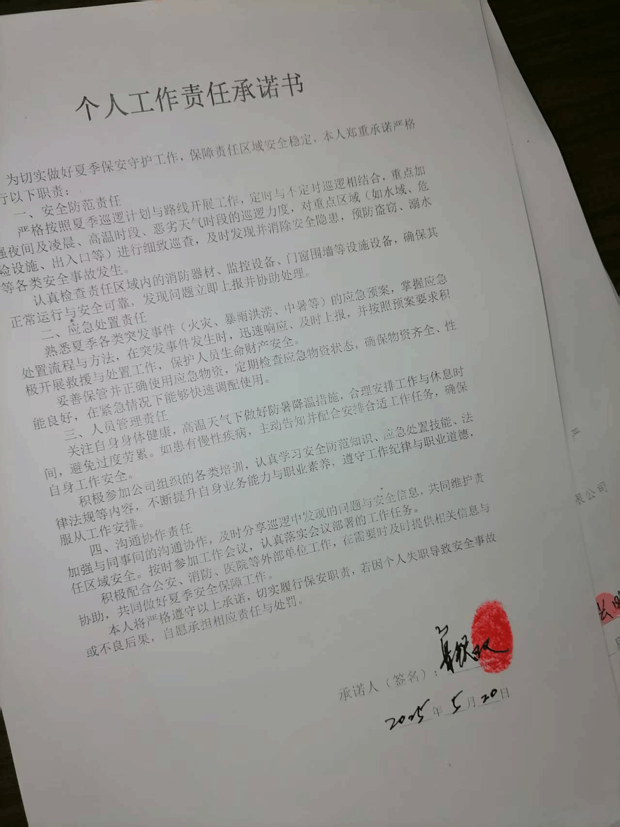 为确保夏季保安守护工作有序开展,公司制定了详细且全面的《夏季保安守护工作实施方案》。该方案将工作内容细化为治安防控、隐患排查、应急处置等8大项26小项具体任务,并推行“定岗、定人、定责”的三定机制。从公司管理层到基层保安人员,人人签订《责任承诺书书》,将安全责任精准压实到每一个岗位、传递到每一个人,形成了“一级抓一级、层层抓落实”的严密责任闭环体系,确保每项工作都有人负责、每项任务都能落实到位。