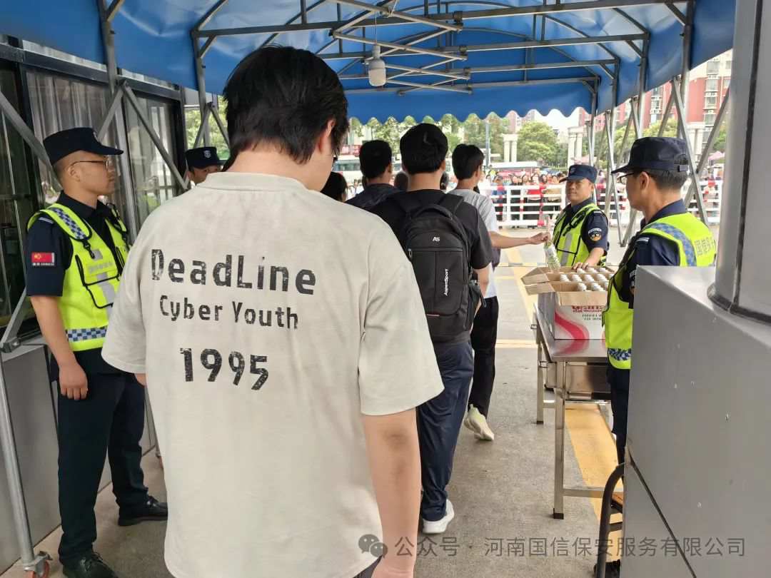 为保障高考期间考点秩序,河南国信保安提前制定专项安保方案,抽调经验丰富的骨干力量组成高考安保小组,明确岗位职责,细化执勤流程。在考点入口,安保人员严格执行安检程序,严防违禁物品进入考场。
