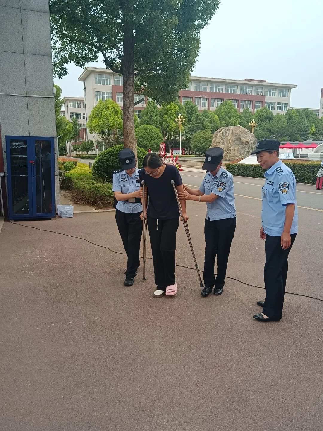 在6月7日考试当天,洛阳第一高级中学考点,一位特殊的考生引起了保安队员们的注意。这位考生因腿部受伤,拄着双拐,行动极为不便。我公司保安队员们毫不犹豫、快速上前,一边安抚考生情绪,一边与考点工作人员沟通协调,确保整个帮助过程既符合考场规定,又能为考生提供最大的便利。在得到许可后,保安队员们小心翼翼地扶着考生,一步一步地走向考场。
