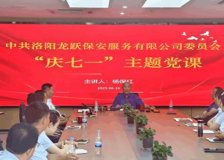 在中国共产党成立104周年之际,为深入学习贯彻党的二十大精神,纪念中国人民抗日战争暨世界反法西斯战争胜利80周年,进一步增强党组织的凝聚力和战斗力,中共洛阳龙跃保安服务有限公司委员会于 2025年6月16日举办了“庆七一”主题党课活动。