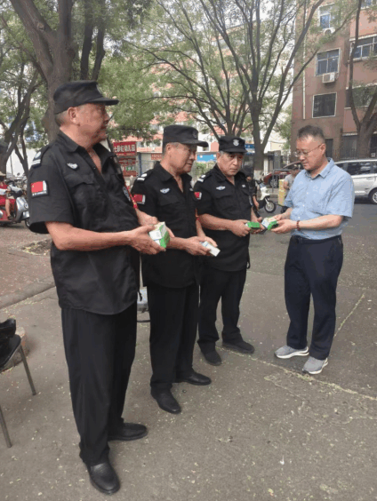 “大家辛苦了!”在二七米房执勤点,公司办公室主任胡杰将一盒盒的藿香正气水和风油精等防暑药品递到当班保安员手中,目光扫过他们被汗水浸透的制服和被烈日晒红的脖颈,“高温时段更要科学安排轮值,保证休息,有任何不适立即报告。”他关切询问队员执勤及身体健康情况,仔细查看岗亭内配备的防暑应急药品是否齐全、风扇运转是否正常。