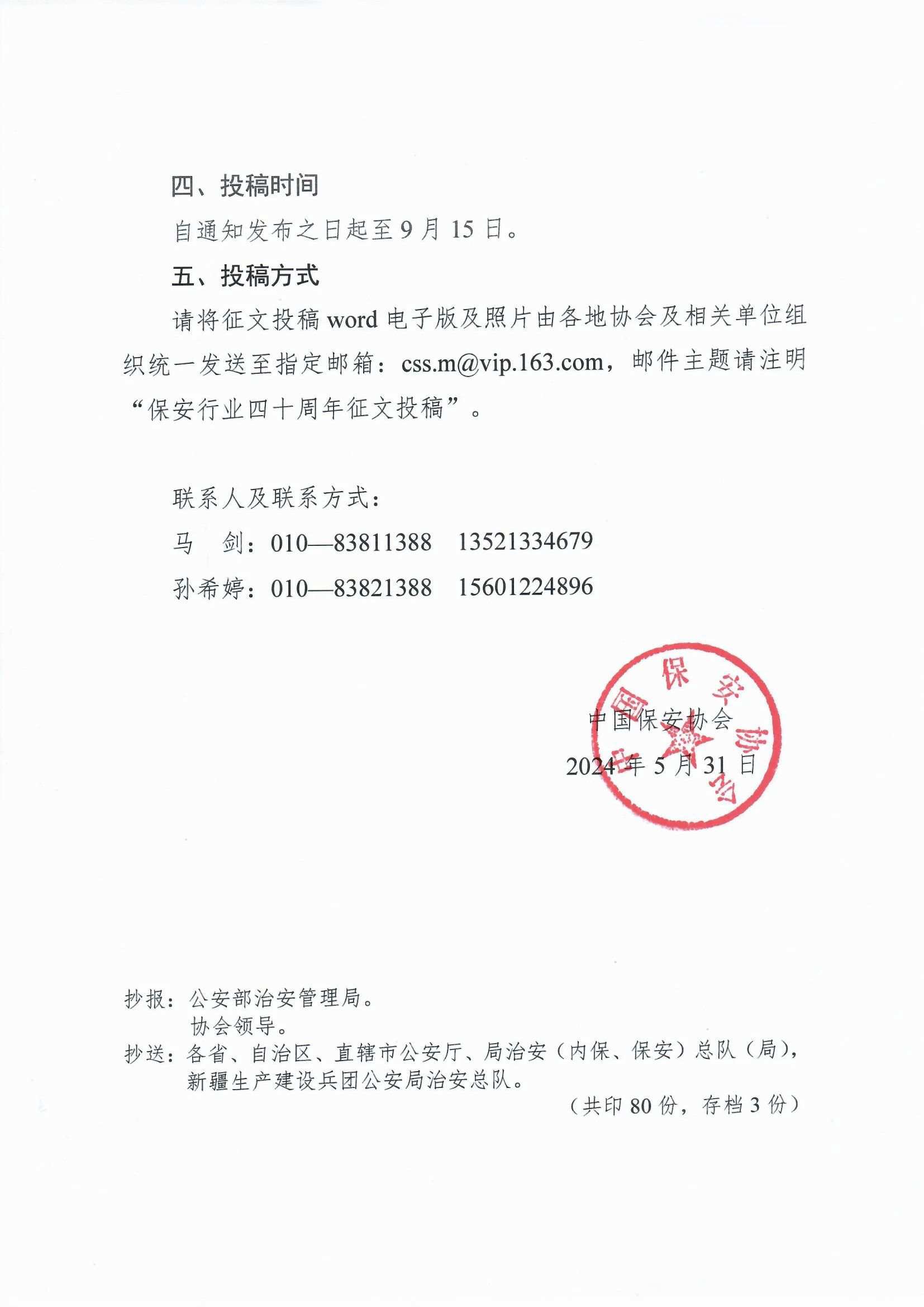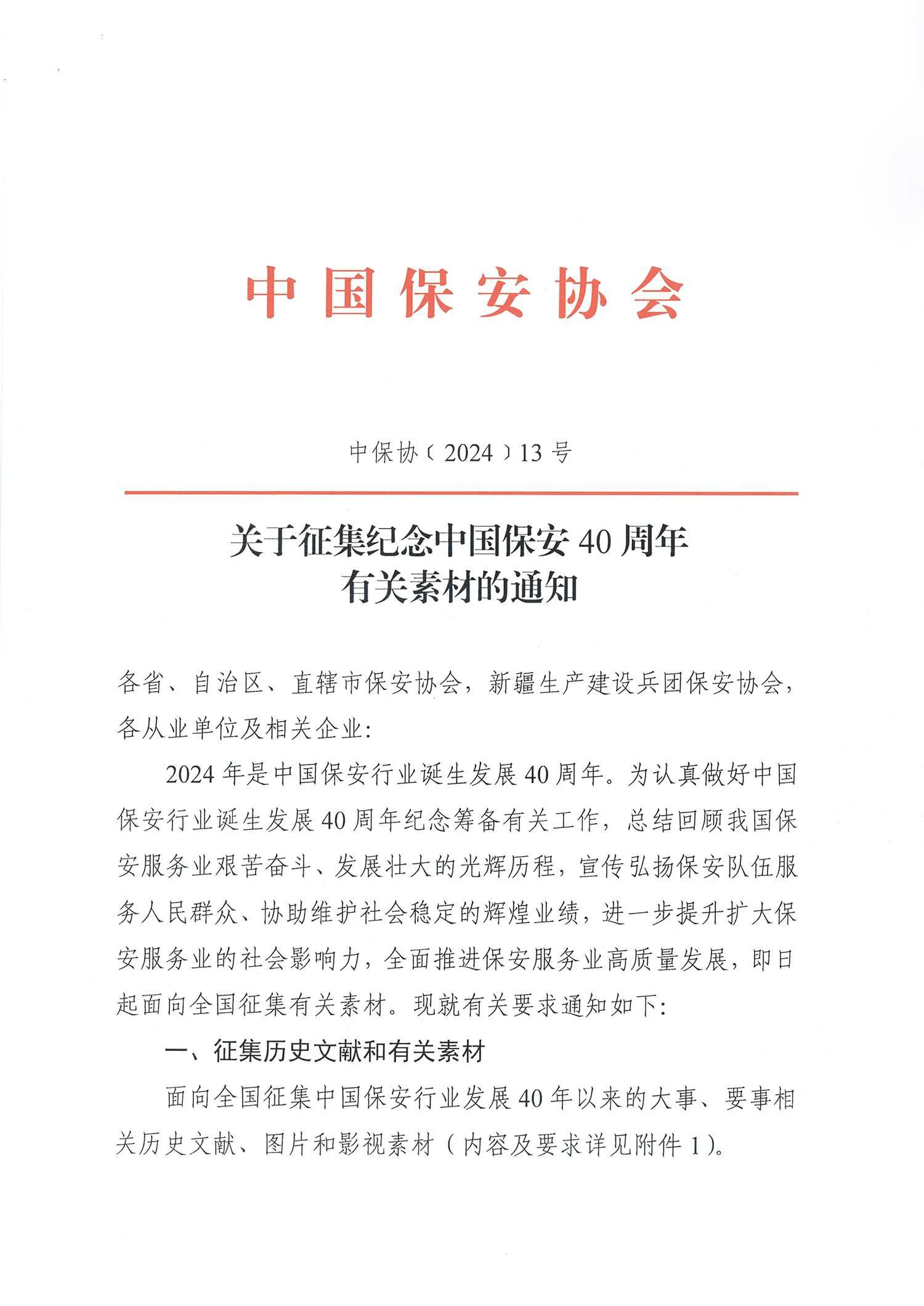 近日,中国保安协会下发《“奋进四十载 建功新时代”征文活动通知》(中保协(2024)11号)《首届全国保安行业短视频大赛作品征集活动通知》(中保协(2024】12号)《关于征集纪念中国保安40周年有关素材的通知》(中保协(2024】13号),部署开展纪念中国保安40周年素材征集活动,现将通知转发给你们,请结合本单位实际踊跃参与,按照通知要求准备素材,分别按以下时间报送省保安协会: