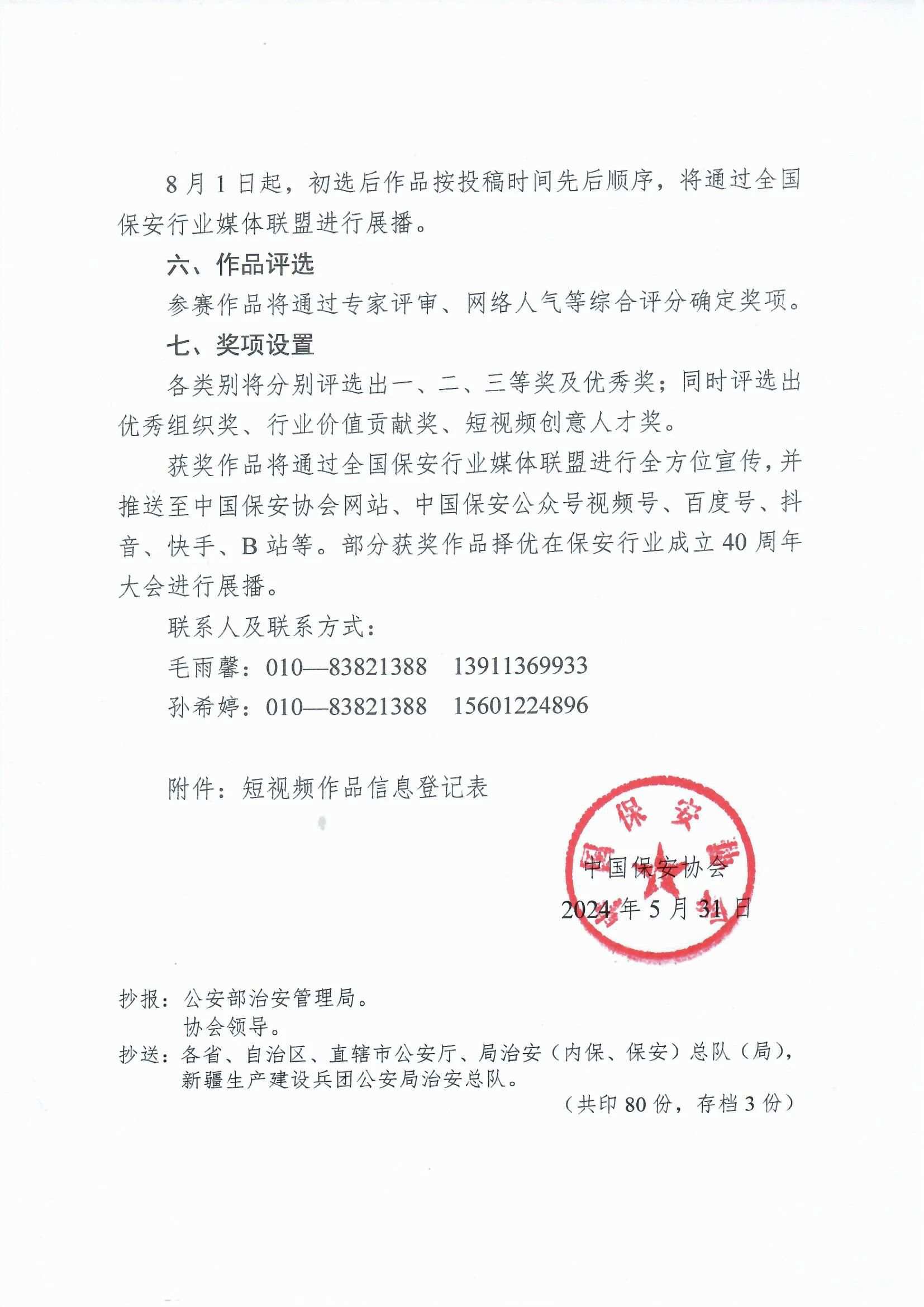 (三)短视频作品及信息登记表请于10月4日前报送邮箱(中国保安协会将于8月1日起展播优秀作品,可提前报送,但最迟不超过10月4日)。