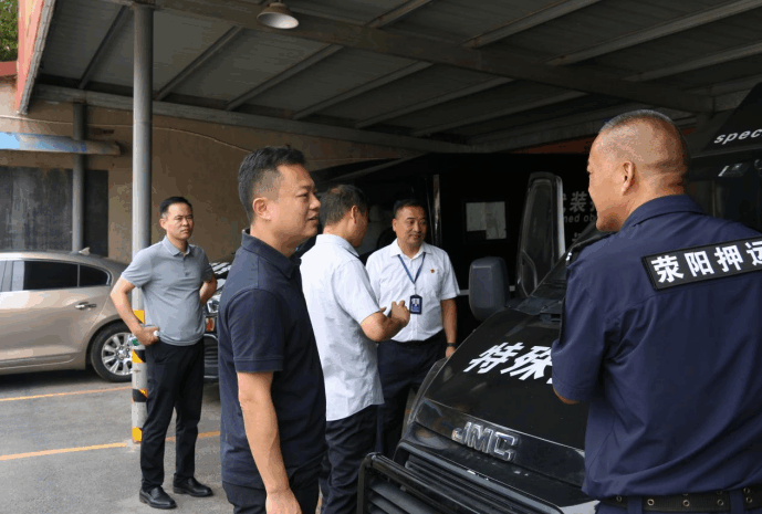 2025年9月2日,河南省公安厅治安总队副总队长赵万铨、支队长刘玉华、郑州市公安局治安支队副支队长张新涛一行,到荥阳市保安服务有限公司押运大队调研指导金融守押一体化系统建设、运行及安全管理工作。公司党总支书记、董事长朱浩谦、党总支副书记徐增光、总经理朱春领等陪同调研。