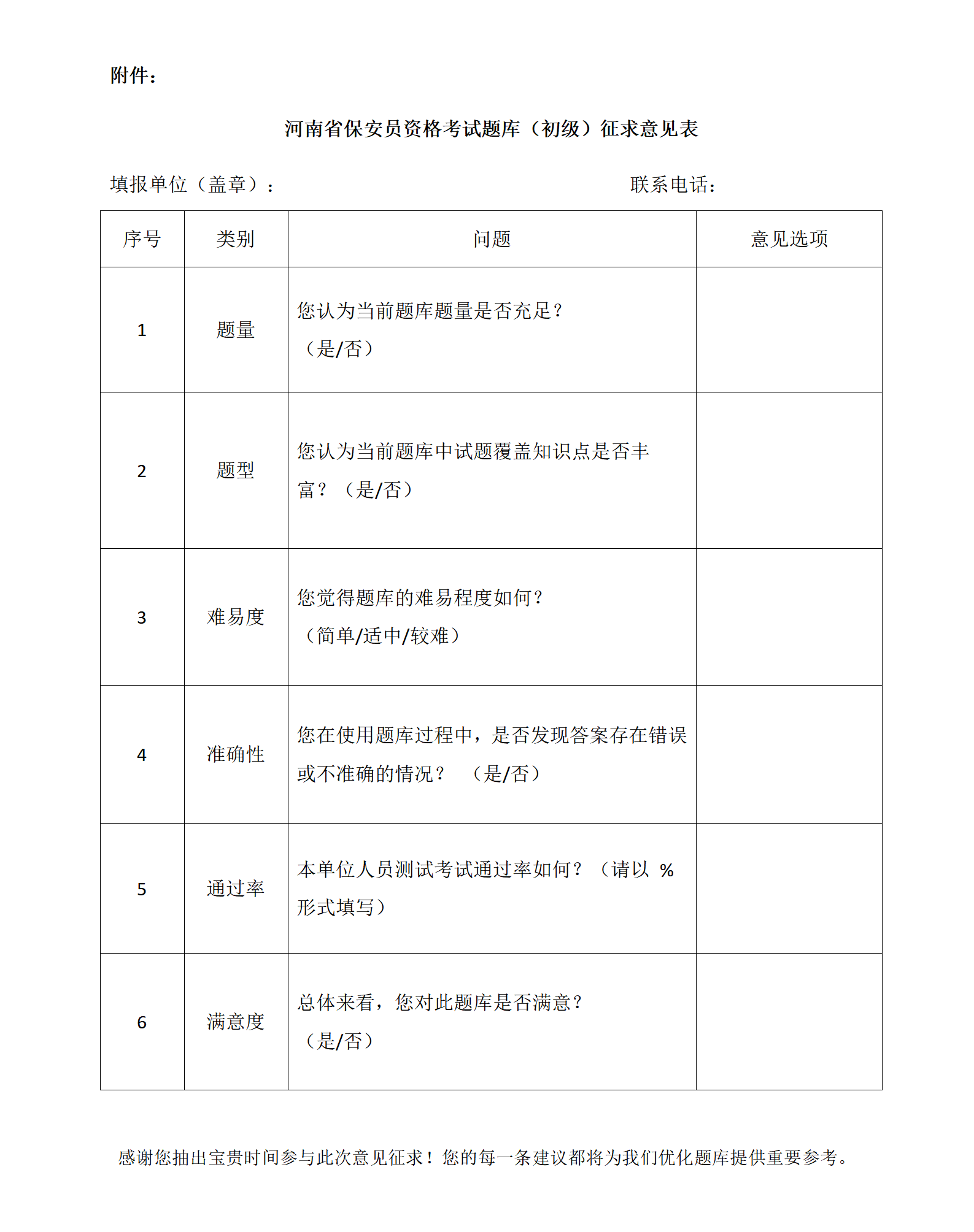 附件:河南省保安员资格考试题库(初级)征求意见表.docx