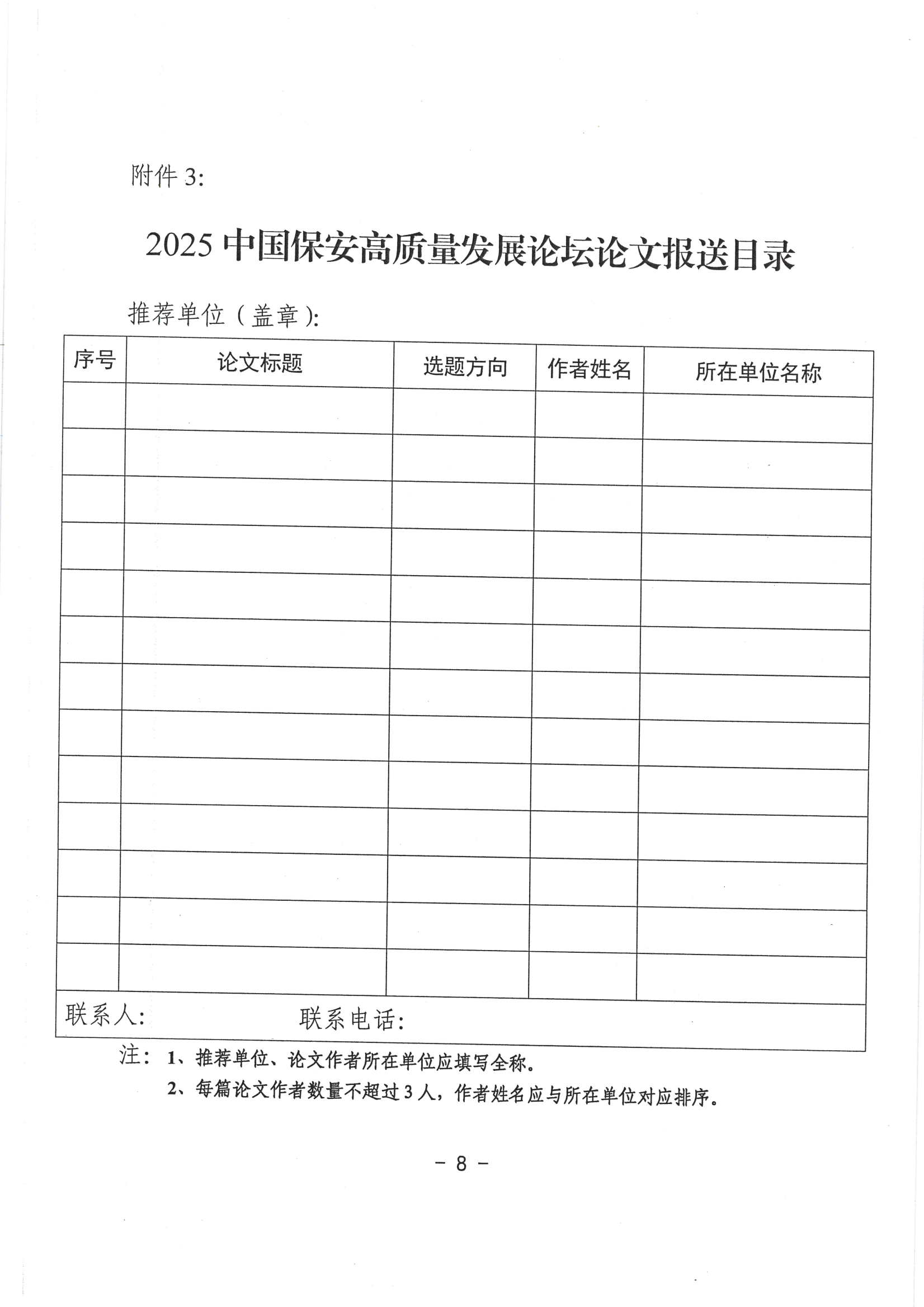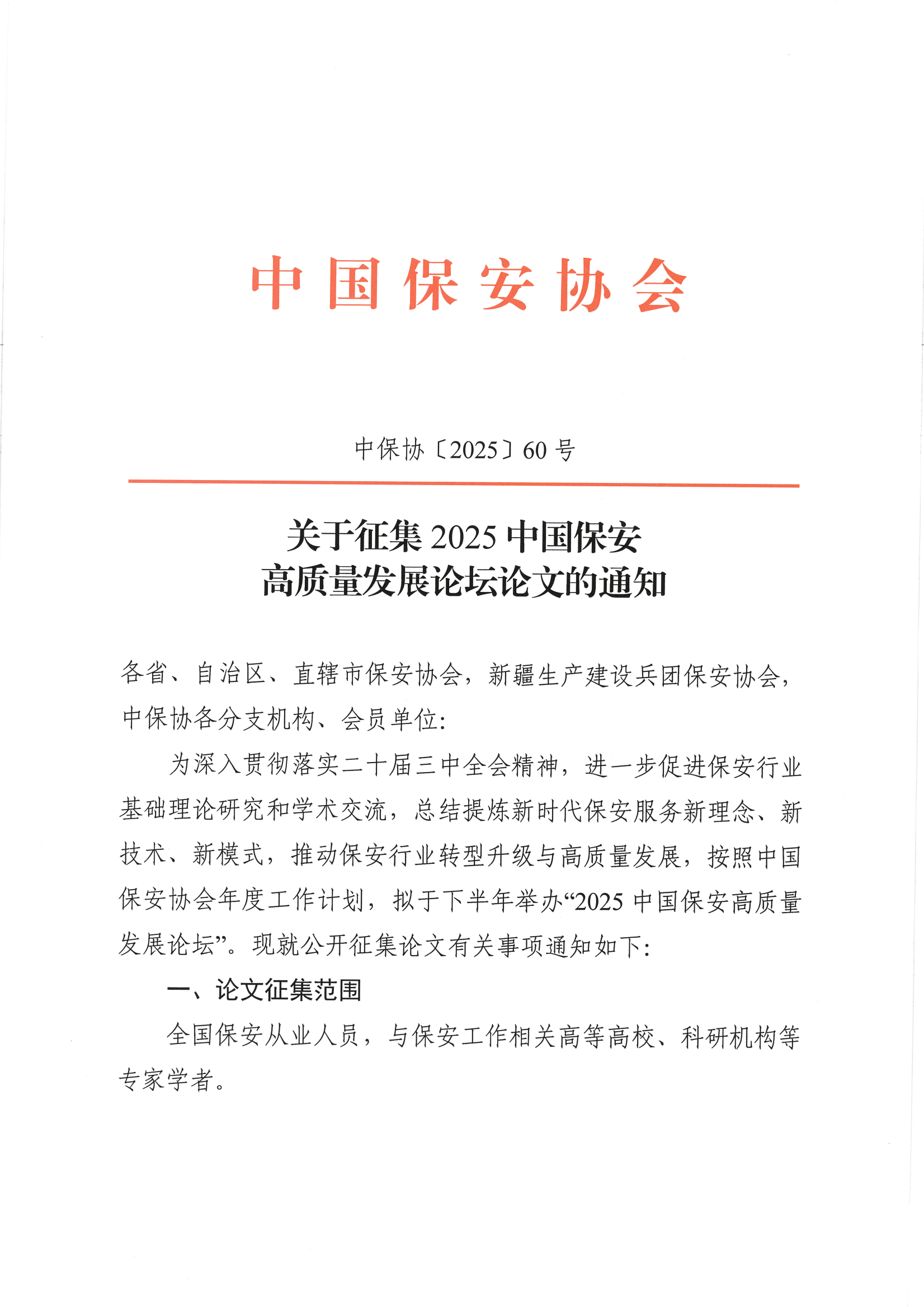 现将中国保安协会《关于征集2025中国保安高质量发展论坛论文的通知》(中保协〔2025〕60号)转发你们,请认真按照通知要求,积极踊跃投稿,并于6月15日前发送至协会邮箱:hnsbaxh@163.com