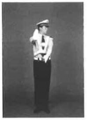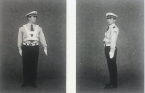(2)左臂与手掌平直向右前方摆动,手臂与身体呈45度,掌心向右,中指尖至上衣中缝,高度至上衣最下一个纽扣。