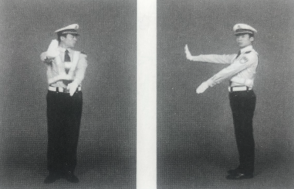 (2)左臂与手掌平直向下方摆动,手臂与身体呈15度,面部及目光保持处于左方45度,手臂完成第一次摆动。