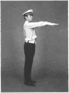 (1)右臂向右前方平伸,与肩平行,与身体呈135度,掌心向下,五指并拢,面部及目光同时转向右方45度。