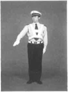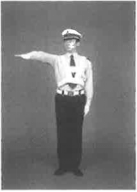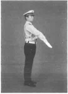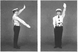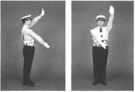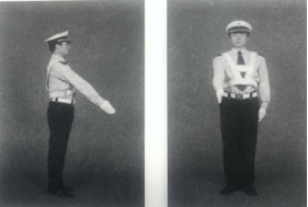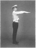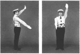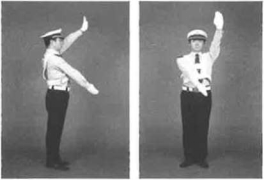 (1)面向来车方向,右臂前伸与身体呈45度,掌心向左,五指并拢,双眼平视前方。