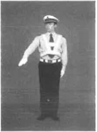 (2)右臂与手掌平直向下方摆动,手臂与身体呈45度,面部及目光保持处于右方45度,手臂完成第一次摆动。