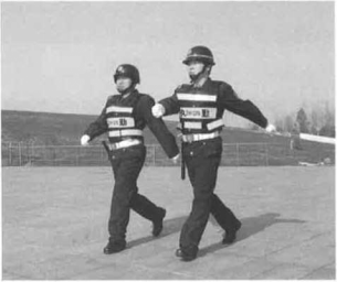 两人成行,即两名保安员左右并排行进,步幅、步速、摆臂等以右侧保安员为基准。