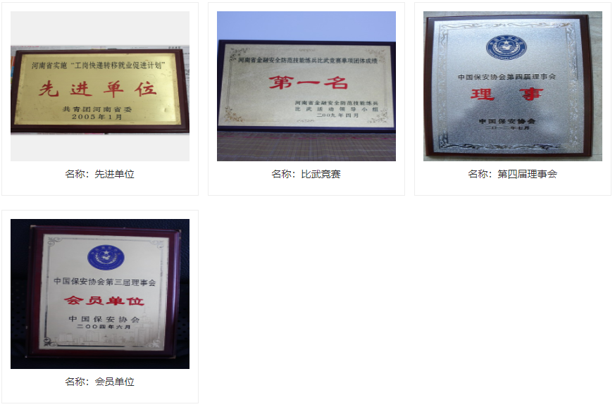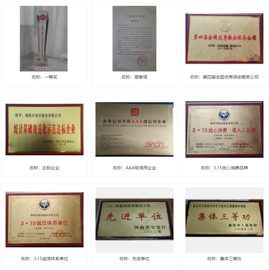 各种金牌荣誉纷至沓来。多次受到公安部治安管理局、省公安厅、市委、市政府、市委政法委和市公安局党委等相关领导的充分肯定和表彰。自成立以来,市保安服务公司就屡屡获得殊荣——“全省再就业先进企业”、“河南省第一届先进保安公司”、“河南省2015年度十佳优秀保安服务公司”、“河南省实施工岗快递转移就业促进计划先进单位”、“第七届全国农民运动会保障工作贡献奖”、“市维稳工作先进单位”、“社会治安综合治理工作先进单位”、“维稳工作先进单位”等等。并涌现了全国第三届优秀保安员、“全国身边好人”王国胜,“全国无偿献血贡献金奖”获得者范聚敏,默默无偿献血近百次、捐献造血干细胞救助生命的李刚等为代表的南阳保安先进典型,他们爱岗敬业,忠于职守,无私奉献,无不展示出保安团队的亮丽风采,谱写了一曲曲感人至深的时代赞歌!