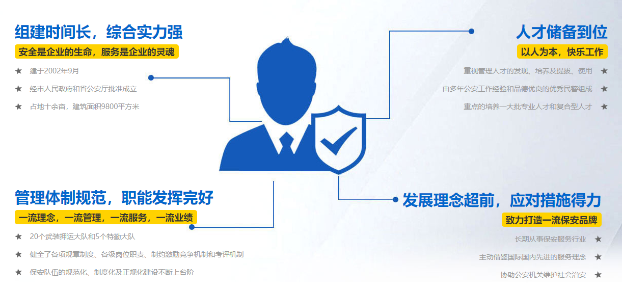 各项保安业务迅猛发展。人力防范不断拓展,遍及全市各行各业;报警体系日益完备,科技创安彰显神威;武装押运安全准点,品牌效应打响业界;职业培训务求实效,强化素质得力支撑,集人防、技防、武装押运、保安培训及保安服装经营销售及保安汽车维修等为一体的规模型、综合型发展格局业已形成。目前,保安公司无论是硬件建设,还是软件建设,无论是发展速度,还是立业规模,均取得了不凡的业绩,不断赢得各级领导和社会各界的充分肯定和好评。