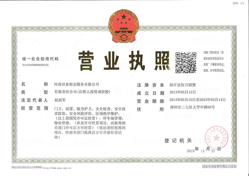河南君泰保安服务有限公司是一家集保安服务(人防、技防、门卫、巡逻、护卫、安检与武装守押)﹑保安人员培训等于一体的保安服务公司,是经河南省公安厅2013(05)号文批准成立的专业保安服务企业,是经郑州市工商行政管理局登记注册成立的保安服务公司,是具有专业化、规范化、科学化、现代化的服务型企业。
