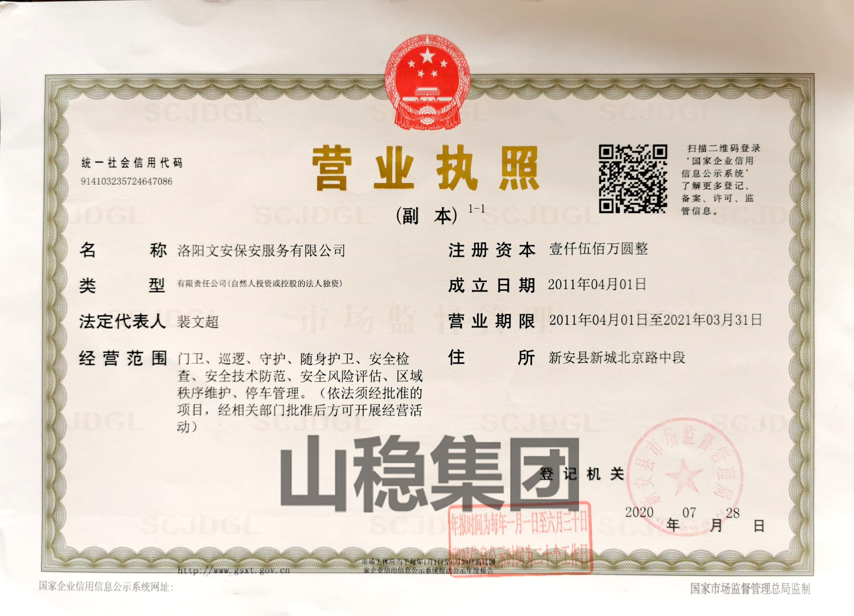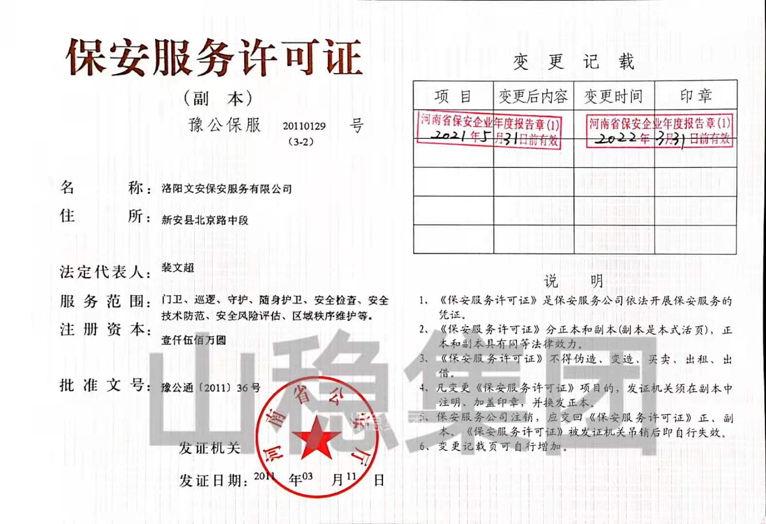 洛阳文安保安服务有限公司经河南省公安厅批准并颁发了《保安服务许可证》,公司的经营范围是:门卫、巡逻、守护、随身护卫、安全检查、安全技术防范、安全风险评估、区域秩序维护等。