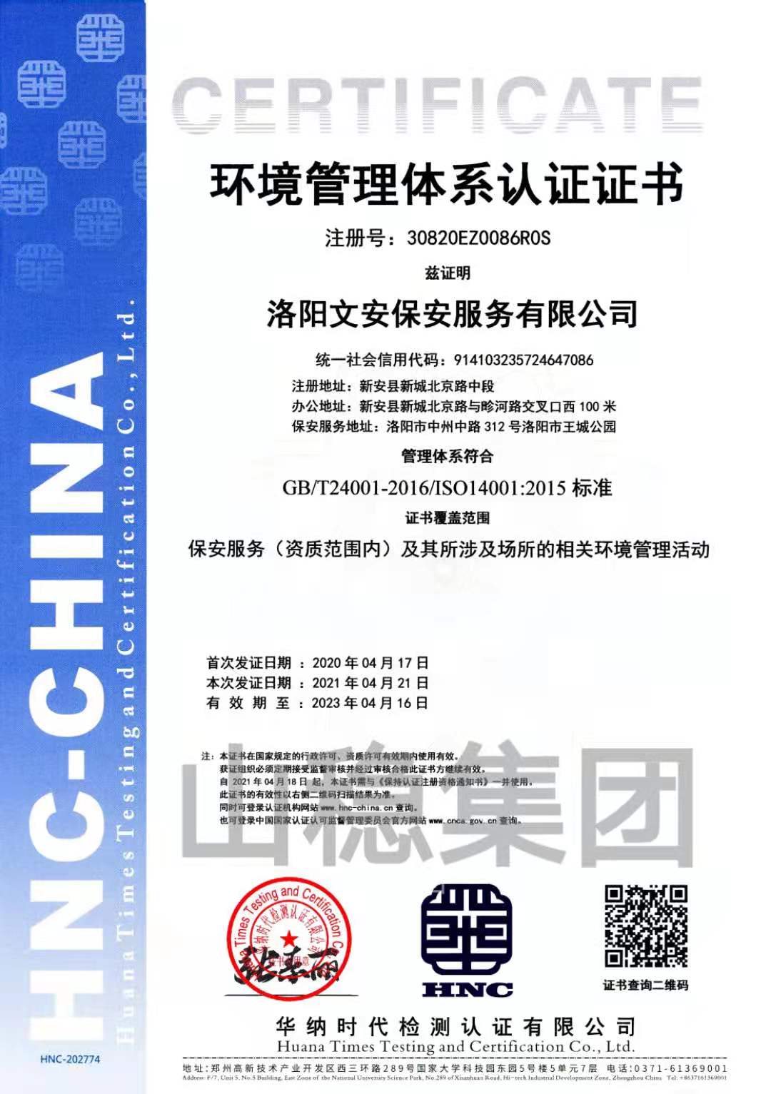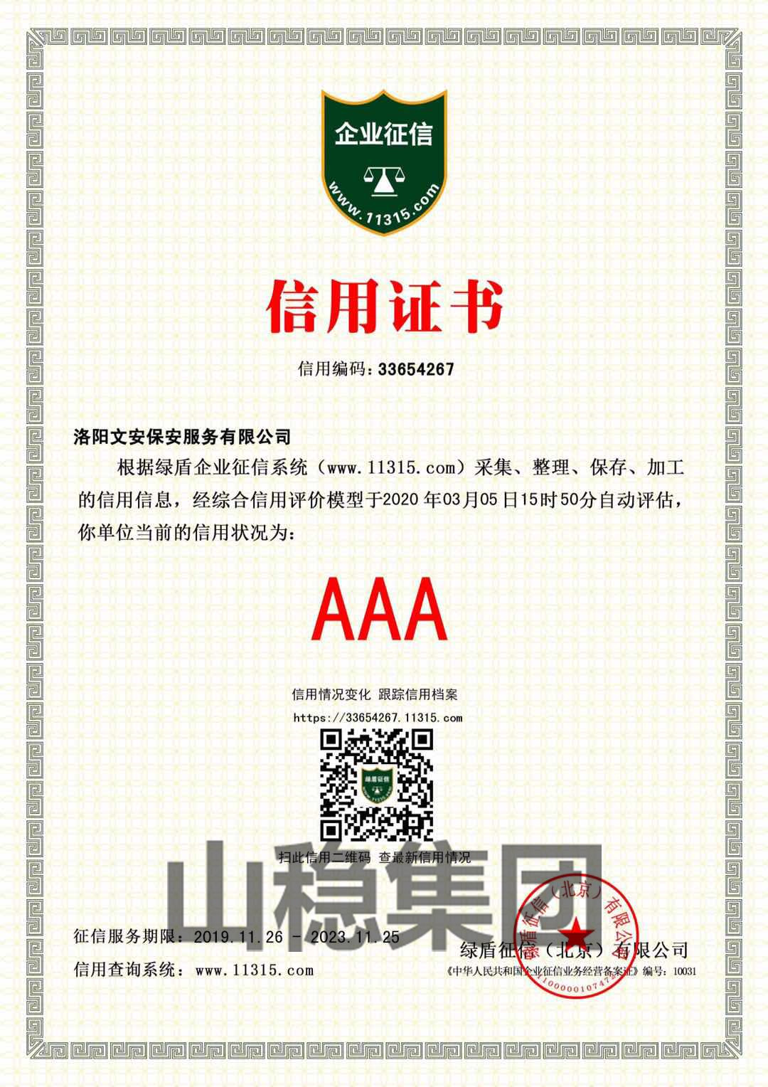 公司系河南省保安服务协会理事单位、洛阳市保安协会会长单位,先后荣获河南省、洛阳市先进保安服务公司荣誉称号,取得了ISO9001质量管理体系认证证书、AAA级企业信用等级证书、AAA级重合同守信用企业证书、立信单位证书。