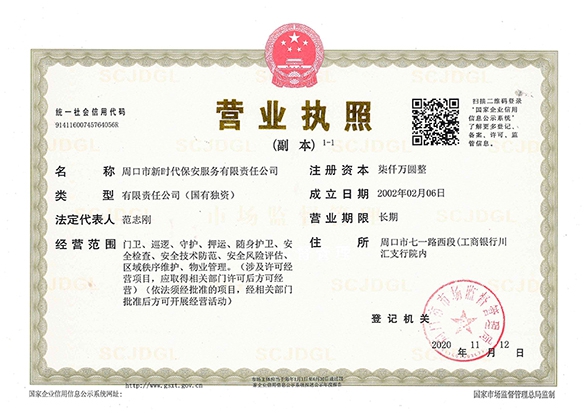 周口市新时代保安服务有限责任公司,注册资金7000万元,注册地址在周口市七一路西段18号(工行银行川汇支行院内),现办公地址在周口市黄河路西段公安局综合楼4-6楼。