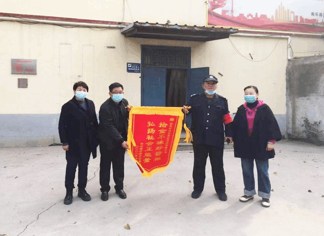 2022年10月16日上午9:00左右,失主吴女士带领家人到西湖保安员执勤处赠送锦旗一面,以示感谢保安员王瑞祥“拾金不昧好榜样,弘扬社会正能量”。