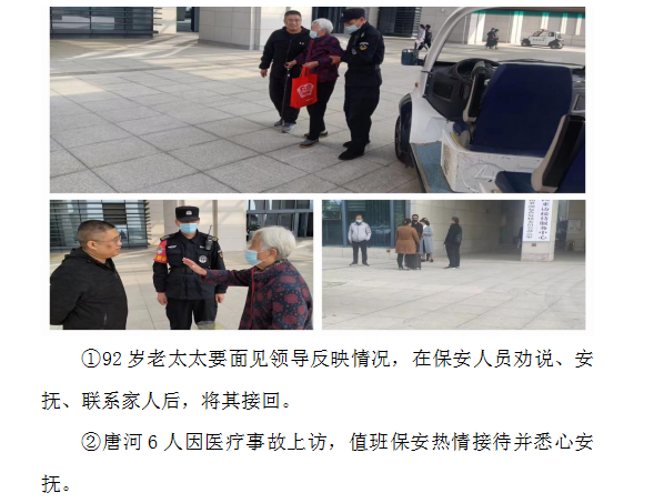 由于公司上下的尽职尽责,不懈努力,使“二十大”期间的各项工作实现稳步推进,成效显著。特别是在一些党政机关、现钞守押、楼群大院、旅游景点景区及各大医院等重要的保安工作岗位,在此期间工作任务加大、保安力量不足的情况下,队员们不辞辛劳、夜以继日、任劳任怨,特保岗位队员坚守岗位累计在岗119530余人次,参与“警保联动”治安巡逻防控工作13040余人次,参与协助疫情防控工作91270余人次,在执勤中和社会上共帮助服务2650名群众;受到社会或群众称赞等突出事迹150件。