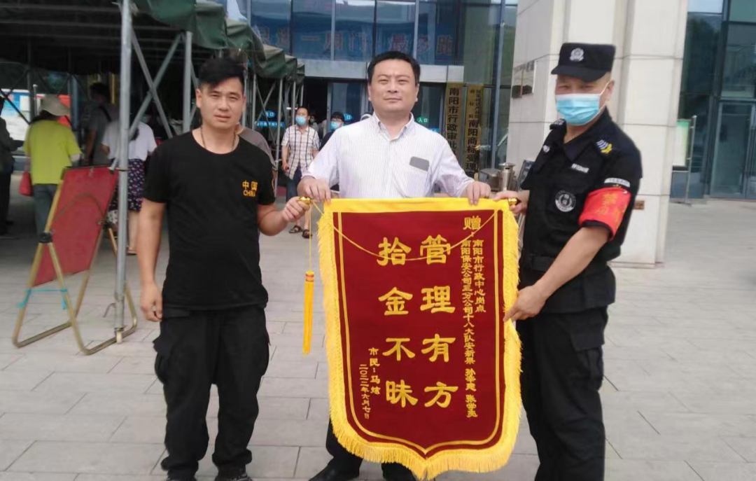 7月5日,一位姓马的市民将一面上写着“管理有方,拾金不昧”的锦旗送至南阳市保安服务公司办公室,连声感谢南阳市行政审批服务中心岗点执勤队员安新果、张学亮拾物不昧品德好。