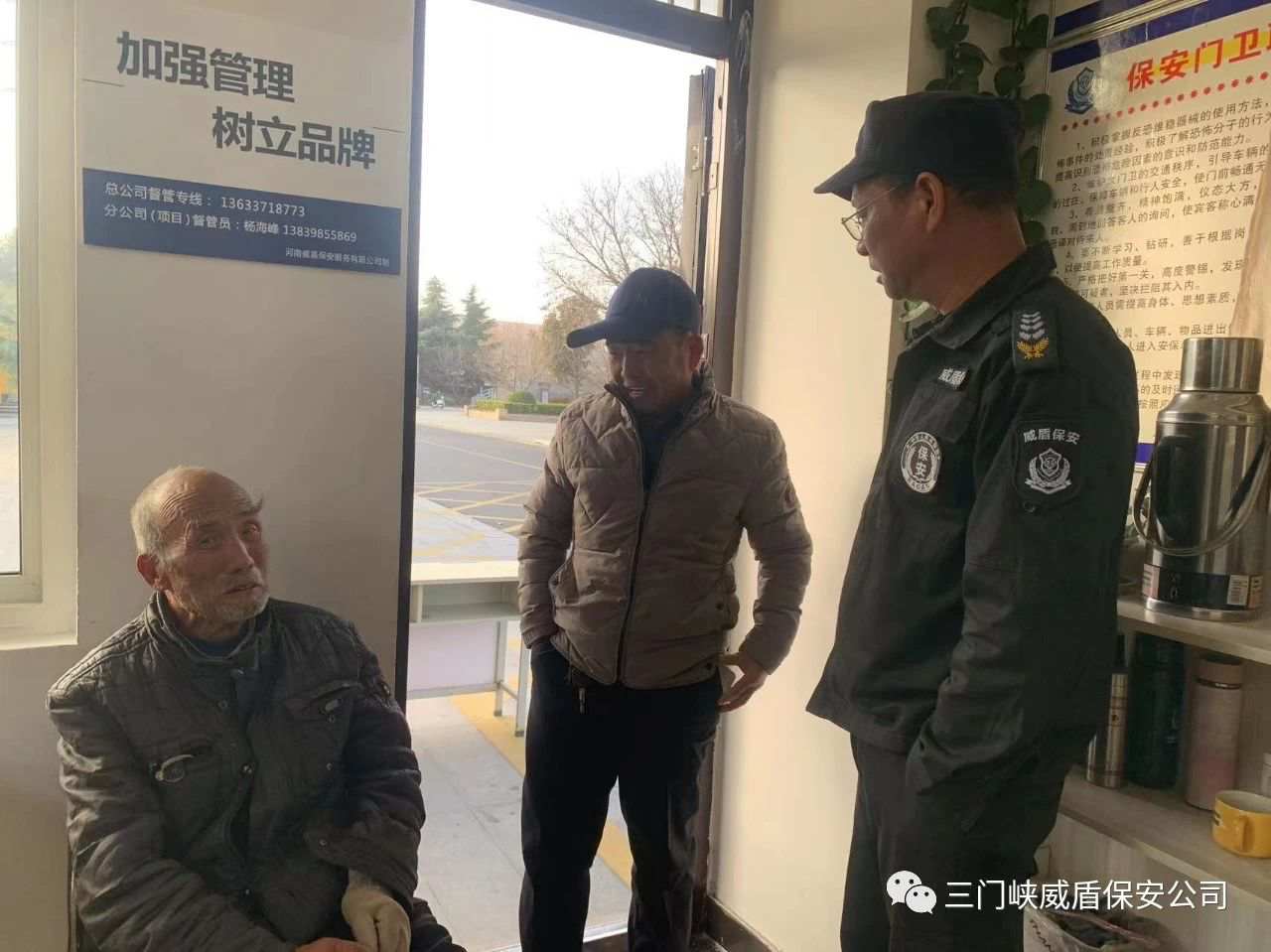 2023年12月6日早上6时,三门峡威盾保安公司保安队员赵震、许爱忠两人在黄河公园西门附近岗点巡逻执勤时,发现公园走道上躺着一位老人身体蜷缩着,当时天刚蒙蒙亮,由于天气寒冷,老人冻得直哆嗦。两名队员合力扶起老人,见其有气无力,说话表达不清,交流困难,随即将其搀扶到岗点值班室内。赵师傅赶忙为老人倒上一杯热水,开了空调帮老人取暖,期间一边安抚老人情绪,一边耐心询问家人信息。等待老人缓过神来后,经询问得知老人今年83岁名叫张群仓,其儿子名叫张建朝,家住湖滨区下横渠村,老人是12月5日下午自己独自一人在黄河公园散步迷失了方向,找不到回家的路,一夜未归,由于天气寒冷加长时间未进食,老人最后冻晕倒在公园马路边上。