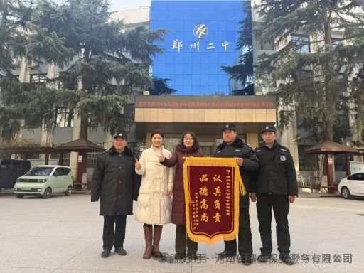 12月30日,郑州市第二初级中学河南鼎盛保安公司保安员收到了来自七年级5班学生家长的一份特别礼物——一面绣有“品德高尚,认真负责”的荣誉锦旗!