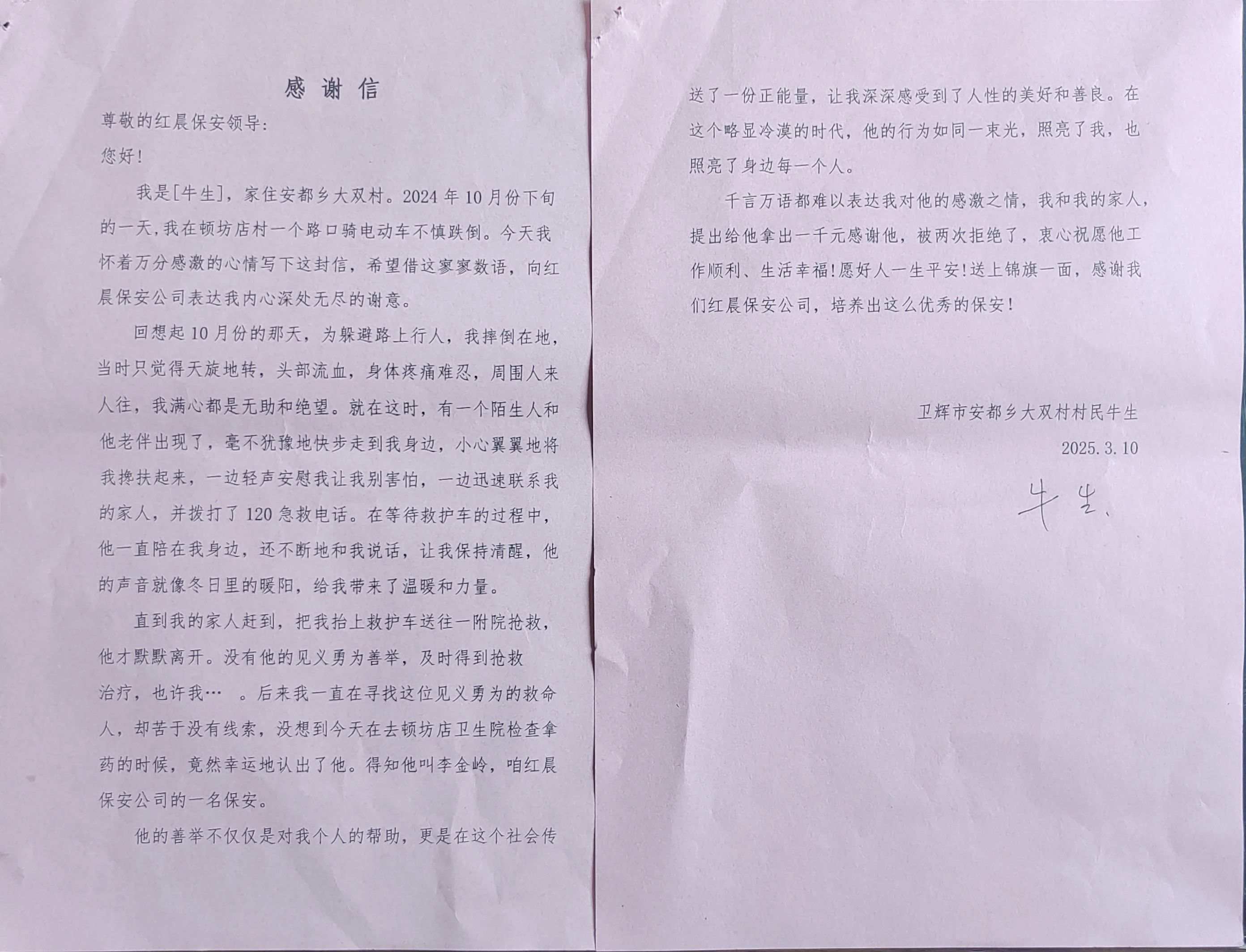 近日,红晨保安公司收到了一封来自卫辉市安都乡大双村村民牛生的感谢信。信中讲述了一段温暖人心的故事,主人公正是我公司保安队员李金岭。他用自己的善举,挽救了他人生命,用实际行动诠释了“守护者”的责任与担当。