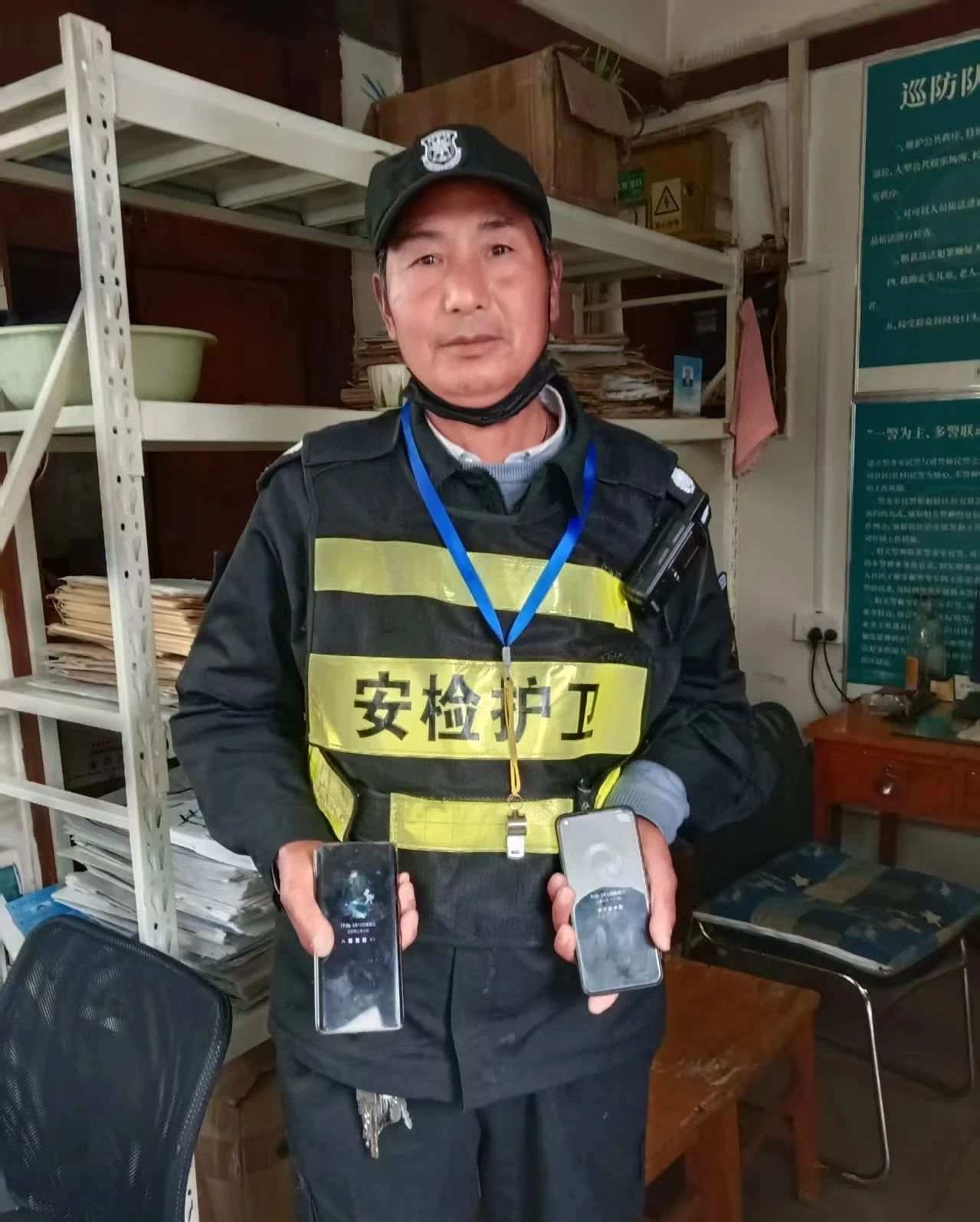 2025年3月12日下午16时50分左右,淮河医院北院西停车场,宏达保安李洪岐在巡逻时发现两部手机静躺在隔离墩旁。金属外壳映着春日的余晖,却掩不住失主可能遭遇的焦急。