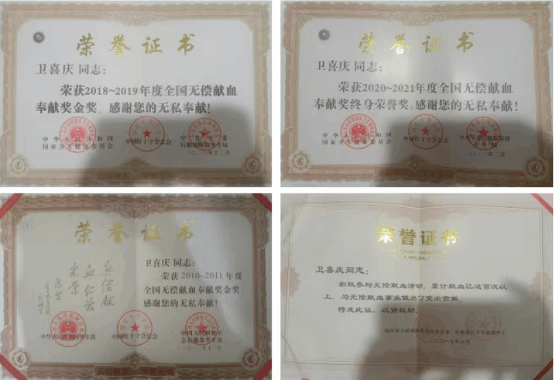 截至目前,年龄56岁的卫喜庆已参加义务献血140次,献血总量55200毫升,捐献血小板126个治疗量。多次荣获中华人民共和国卫生部(卫健委)、中国红十字会总会及中国人民解放军总后勤部卫生部(局)联合颁发的荣誉证书。