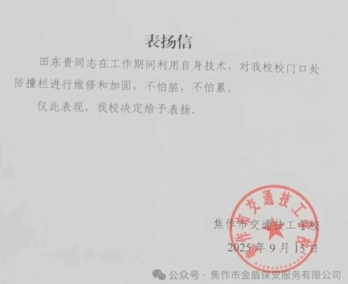 近日,焦作金盾人防七部保安员田东贵利用自己所学的电焊技能帮助校园对防撞栏进行加固,受到客户单位好评。