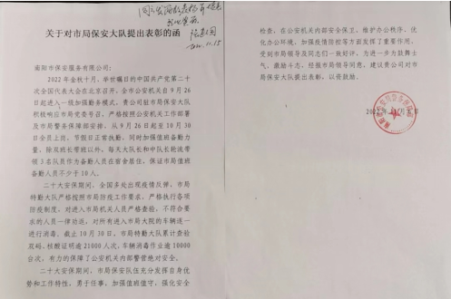 来函中最后说,在二十大安保期间,该大队充分发挥自身优势和工作特性,勇于任事,加强值班值守,强化安全检查,在公安机关内部安全保卫、维护正常办公秩序、优化办公环境、加强疫情防控等方面发挥了积极作用,受到市局领导及同志们的一致好评。