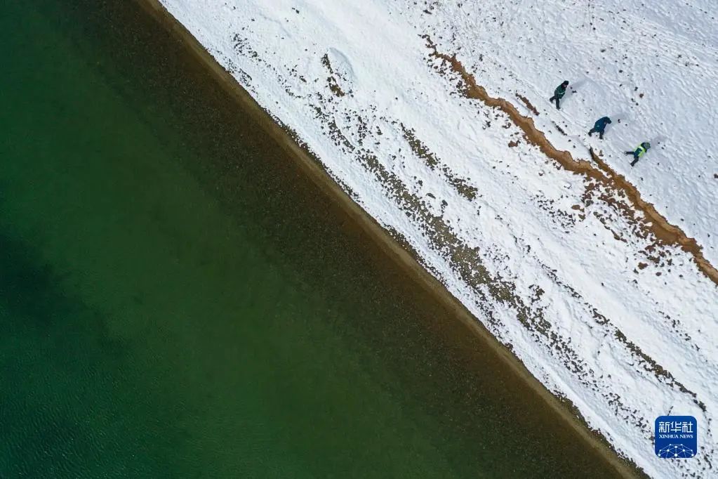 2021年10月20日,在青海省果洛藏族自治州玛多县扎陵湖乡勒那村,三江源国家公园黄河源园区生态管护员在巡护(无人机照片)。新华社记者 张龙 摄