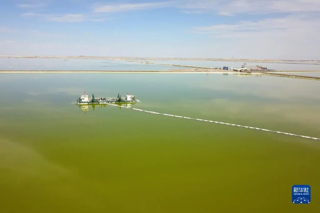 这是2022年6月13日在青海柴达木盆地拍摄的察尔汗盐湖上的采盐船(无人机照片)。新华社记者 范培珅 摄