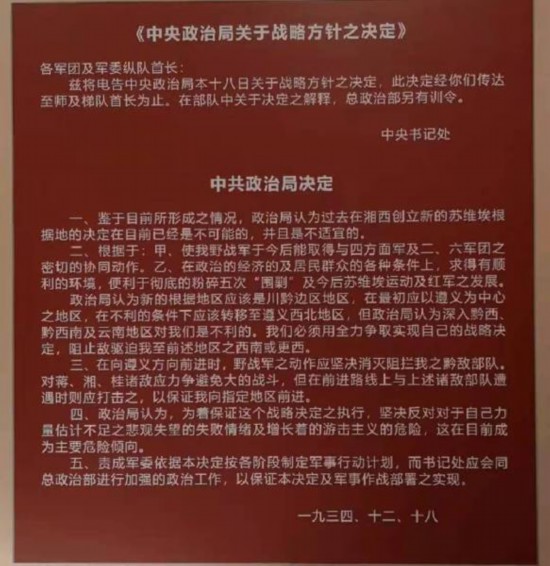 “鉴于目前所形成之情况,政治局认为过去在湘西创立新的苏维埃根据地的决定在目前已经是不可能的,并且是不适宜的”。