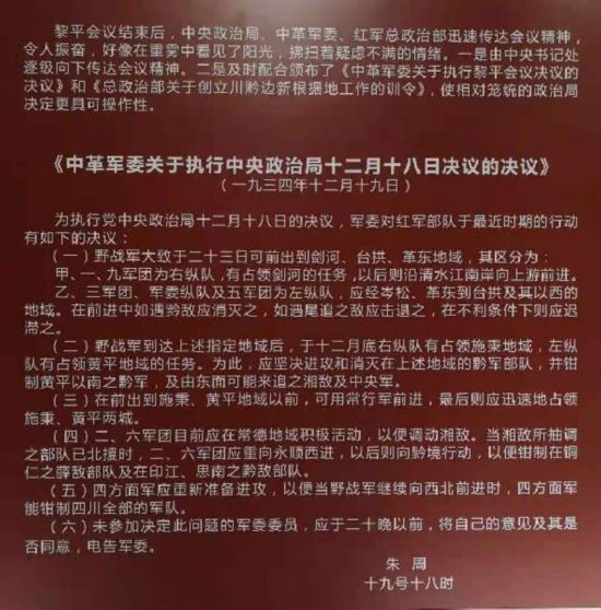 会议从白天开到深夜,争论十分激烈。最终,与会多数同志接受了毛泽东同志“向黔西北进军”的正确主张,通过了根据他的发言写成的《中央政治局关于战略方针之决定》。