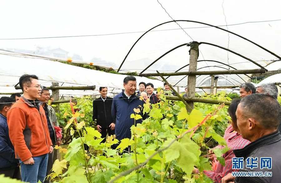 2021年4月25日,习近平在桂林市全州县才湾镇毛竹山村,走进葡萄种植园,同农技人员和村民亲切交流。新华社记者 谢环驰 摄