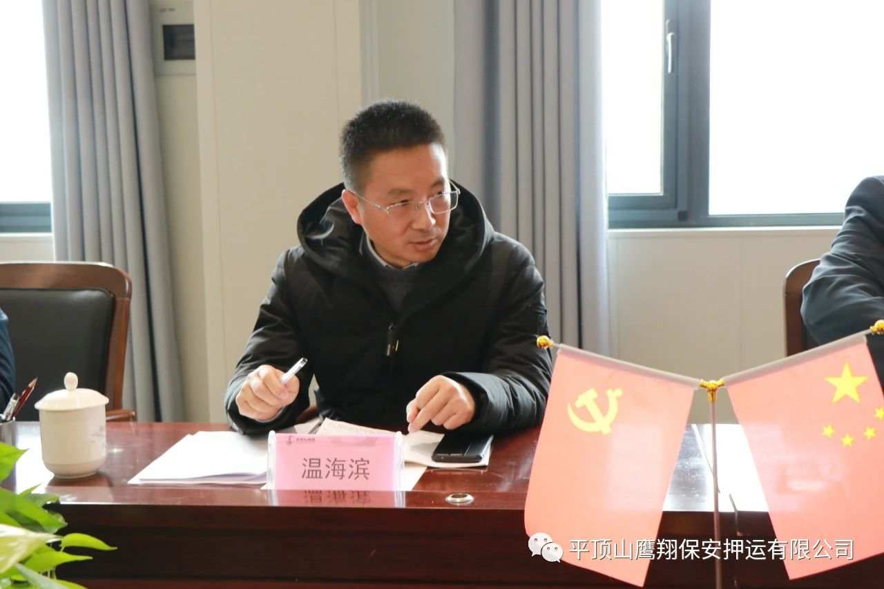 按照市委组织部和中共平顶山交通水利建设投资有限公司委员会(以下简称“交水投公司党委”)要求,2023年2月16日上午,平顶山鹰翔保安押运有限公司(以下简称“平顶山鹰翔”)召开2022年度组织生活会,深入查摆班子和个人存在的问题和不足,深刻剖析思想根源,明确努力方向和整改措施。交水投公司党委委员、副总经理温海滨专程莅会指导,平顶山鹰翔党总支书记、总经理杨海生,平顶山鹰翔党总支副书记、副总经理吴昊,平顶山鹰翔党总支委员、工会主席孙红声及经营管理团队党员干部参会。会议由吴昊主持。