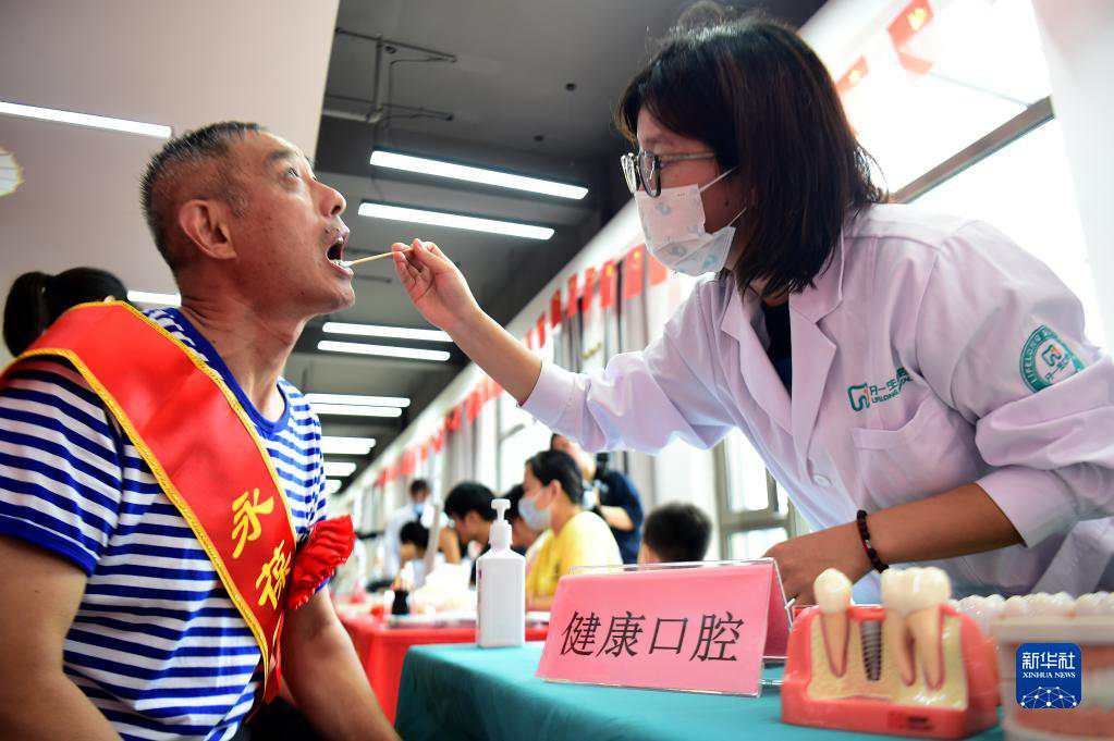 安徽省合肥市蜀山区洪岗社区志愿者为市民检查口腔(2022年7月29日摄)。新华社记者 黄博涵 摄