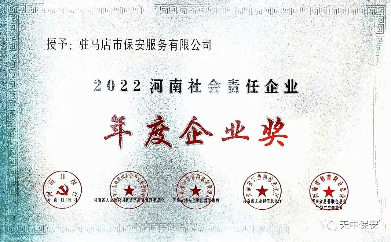 今年的推选活动自启动以来,得到了社会各界的积极响应,有300多家企业报名参加,经过资料审核、网络投票、媒体公示、专家评审等环节,最终推选出了81家热心公益事业、有责任、有担当、无私奉献的社会责任企业和24名坚韧不拔、勇于担当的突出贡献企业家。该项活动自2020年启动以来,驻马店市保安服务有限公司已连续3年被评为“河南社会责任企业”;公司党总支书记董事长姚红卫连续两年被评为“河南社会责任企业突出贡献企业家”。