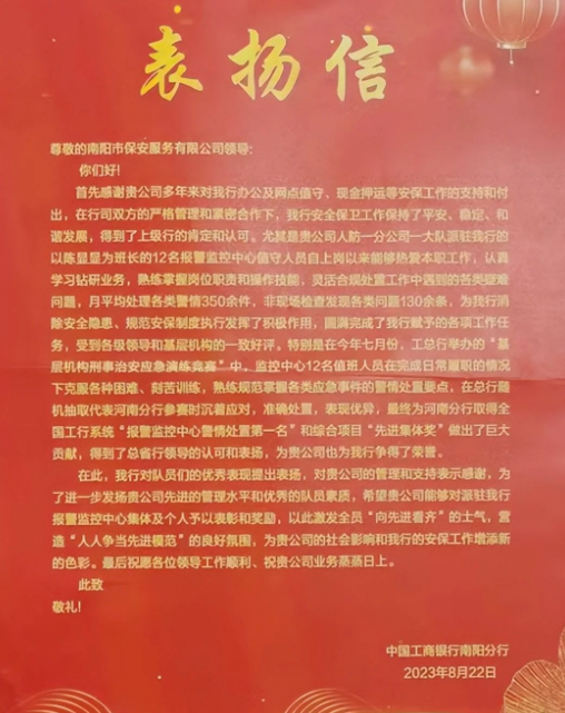 最后,工行南阳分行在《信》中反复强调,“对队员们的优秀表现提出表扬,对贵公司的管理和支持表示感谢”、“为了进一步发扬贵公司先进管理经验和优秀队员的良好素质,希望贵公司能够对派驻我行报警监控中心集体和个人予以表扬和奖励,以此激发全员“向先进看齐”的士气,营造“人人争当先进模范”的良好氛围,为公司的社会影响和我行的安保工作增添新的色彩。”