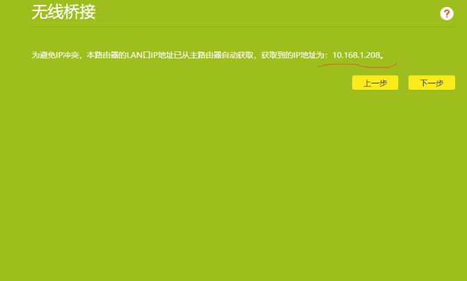 输入后,就成功连接到了主路由器了,为了防止ip冲突,主路由器自动分配一个ip地址给副路由器,这个ip地址跟主路由器ip属于同一网段。