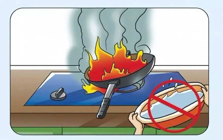 油锅起火,应用灭火毯或锅盖盖上,或倒入青菜,不可用水灭火。