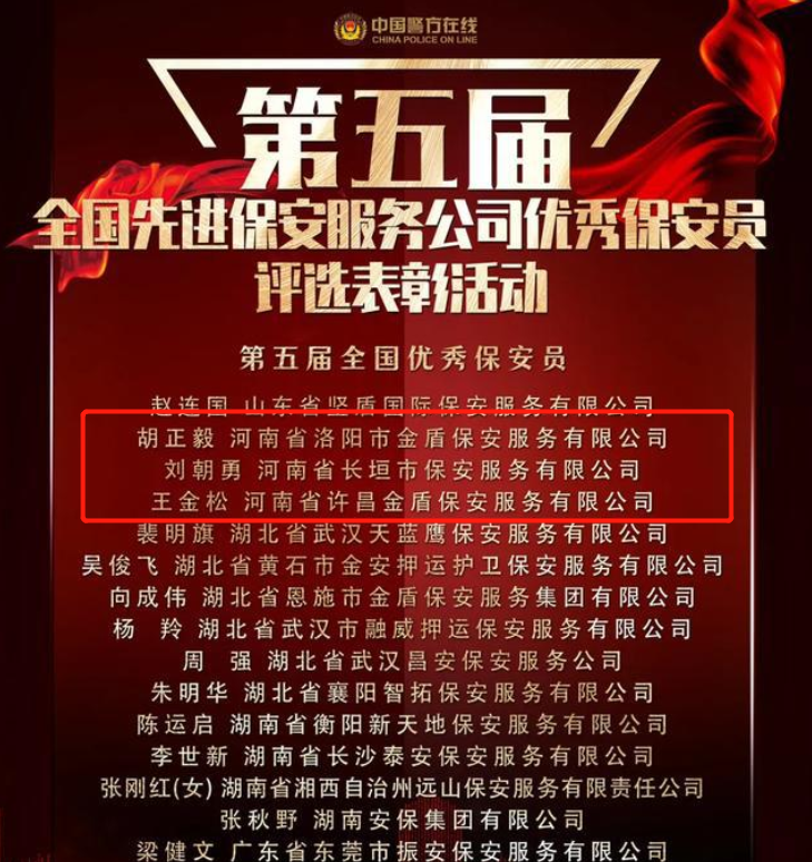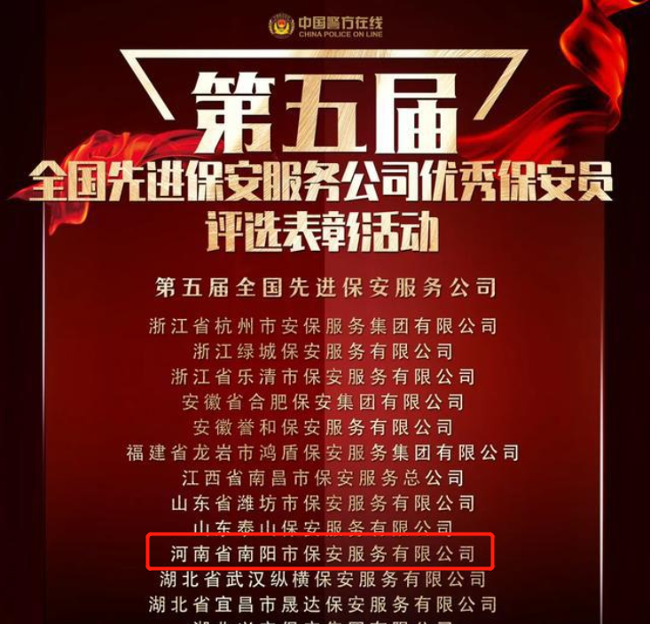 近日,公安部、中华全国总工会、共青团中央联合发布表彰决定,对全国50家先进保安服务公司、100名优秀保安员进行表彰,河南省南阳市保安服务有限公司等50家保安服务公司被评为“第五届全国先进保安服务公司”,胡正毅、刘朝勇、王金松等100名保安员被评为“第五届全国优秀保安员”。