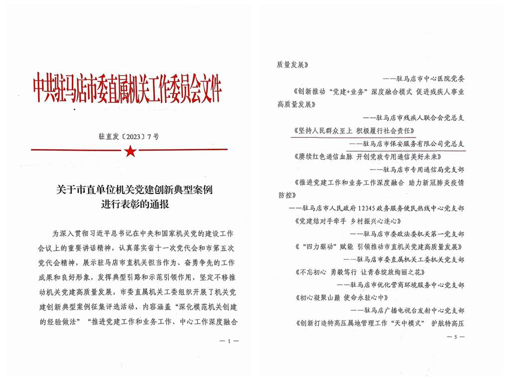 此次表彰对保安公司是极大的鞭策和鼓舞,公司党总支将带领所属5个党支部以此次表彰为契机,认真学习市直机关其他单位的先进经验与做法,认真借鉴,进一步树牢“抓企业党建是本职、不抓企业党建是失职、抓不好企业党建是渎职”的理念,聚焦主责主业,压实党建责任,不断总结党建工作的新经验、新做法、新成果。始终坚持问题导向,认真对照查摆,深入分析问题不足,拿出管用实用的举措加以解决,确保问题清零,取得实效,在抓贯彻落实中多思考谋划、多探索研究、多总结提炼,切实以求真务实、踏实留痕的精神,力争上游,营造“比学赶超、创先争优”的浓厚氛围,推动“后进赶先进、中间争先进、先进更前进”,全面提升公司党建工作水平,推动公司党建工作再上新台阶、再取新成就,为助推现代化驻马店高质量建设提供坚强组织保证,为助推现代化驻马店高质量发展贡献国企党建力量。