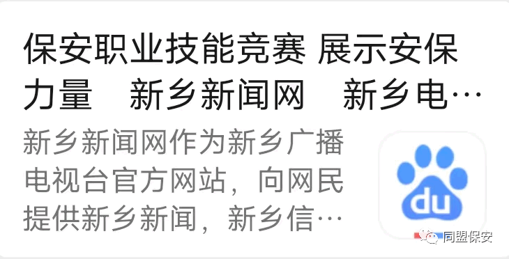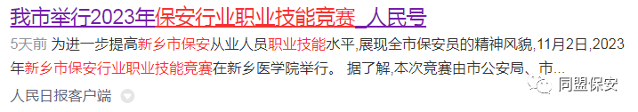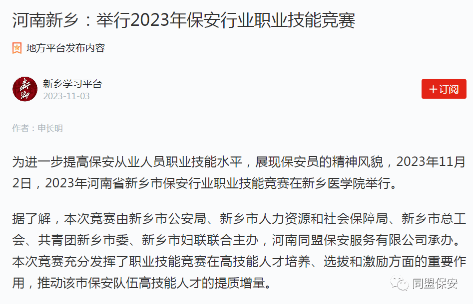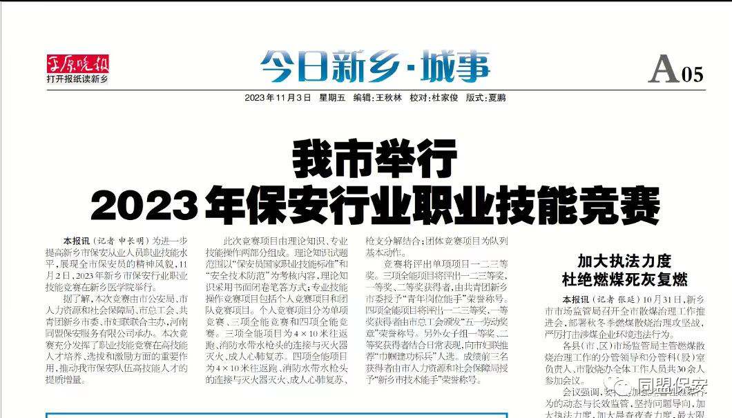 2023年新乡市保安行业职业技能竞赛活动由新乡市公安局、新乡市人力资源和社会保障局、新乡市总工会、中国共产主义青年团新乡市委员会、新乡市妇女联合会联合主办,河南同盟保安服务有限公司承办、河南天之盾智慧保安服务有限公司、河南赛夫保安服务有限公司、新乡市联达保安服务有限公司协办,大赛圆满完成,本次活动被平原晚报11月3日第5版、新乡日报11月4日第2版刊登,新乡电视台新闻综合频道、新乡大民生、新乡新闻网、百度平台、人民日报客户端、中共中央宣传部学习强国平台相继转发报道。