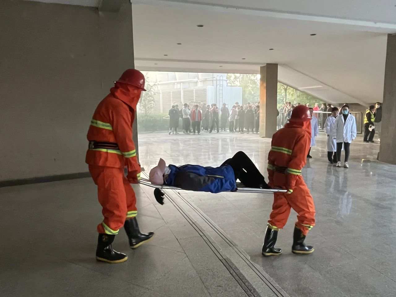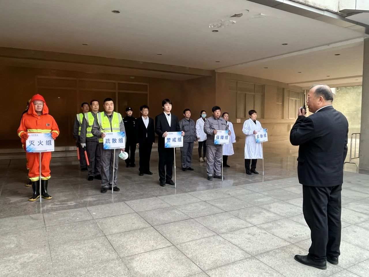 随后,课堂转至室外。伴随着几声急促的警报声,消防应急疏散演练拉开帷幕。全体应急小组集结,按照预案规定启动应急响应程序,迅速前往火情现场进行勘察,核实现场人员情况、确认火势情况。
